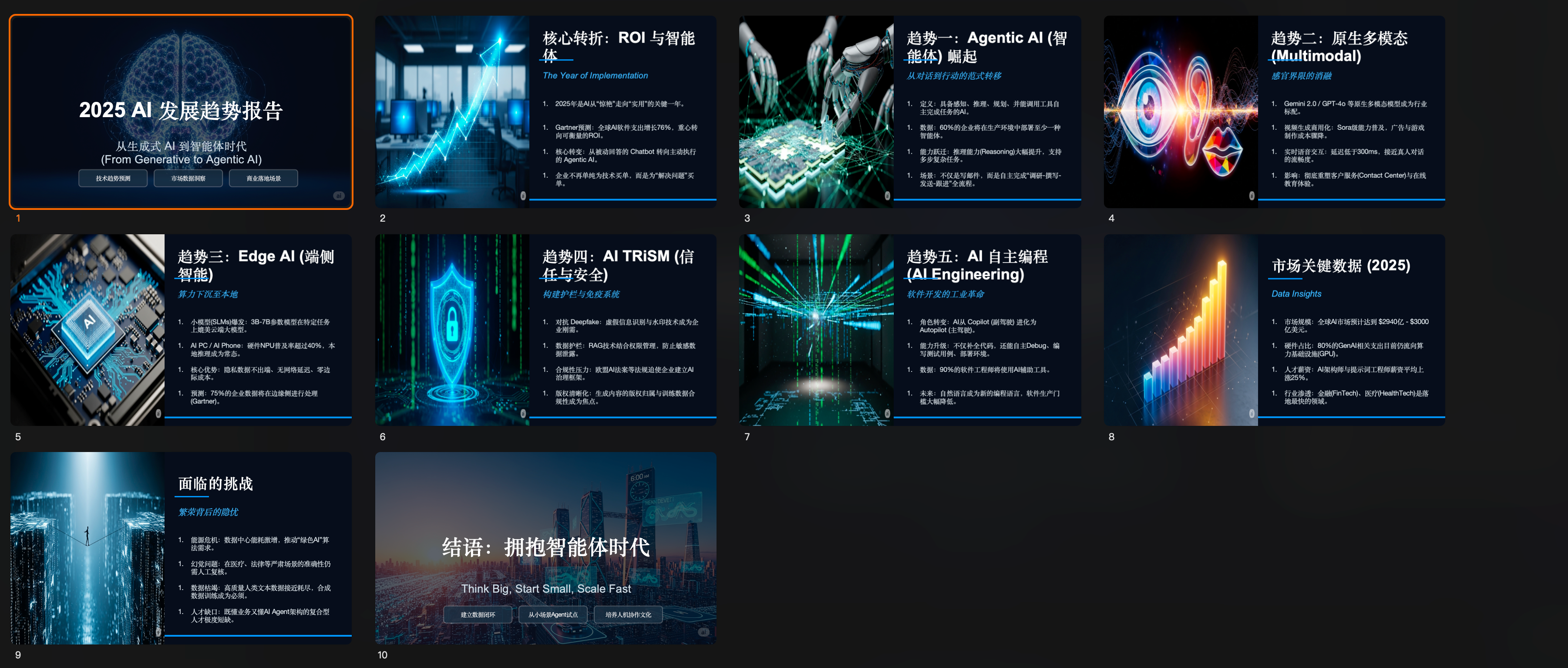 生成了10页,深蓝色底+多彩配图。