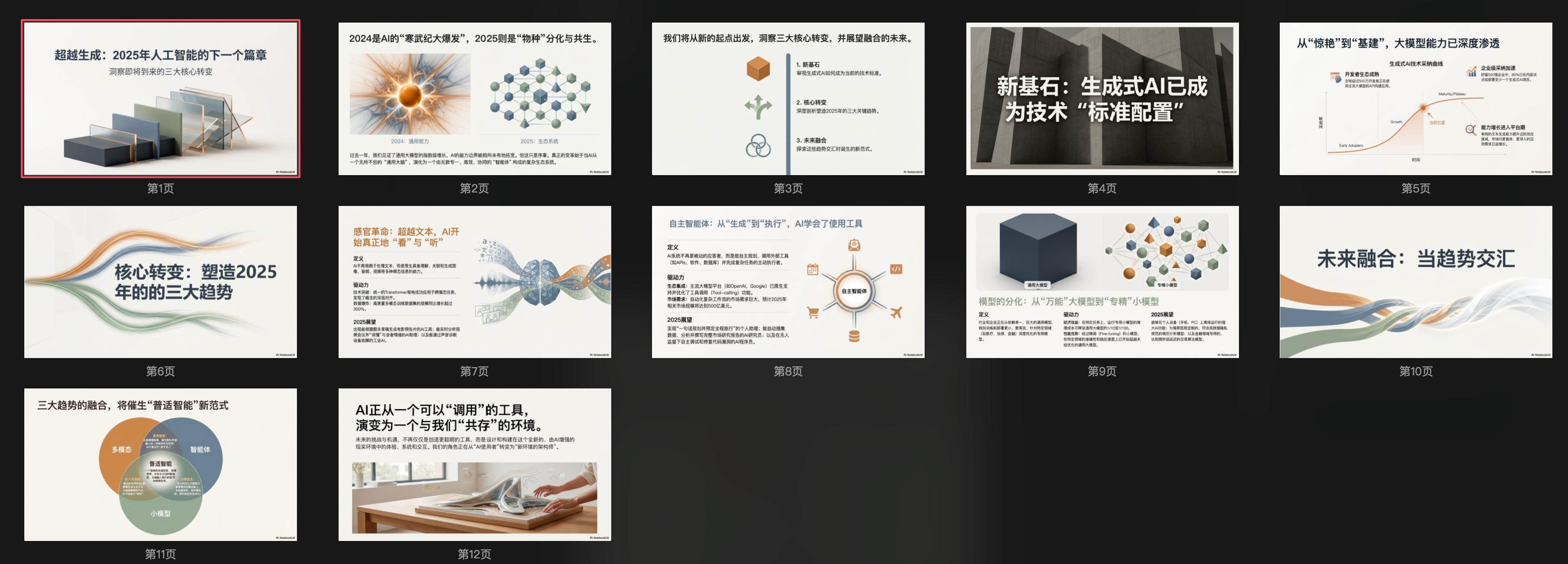 追求 设计感 + 内容更深(接受只能导出PDF)→ 选 NotebookLM(风格简洁大气,内容严谨,需转换才能编辑)